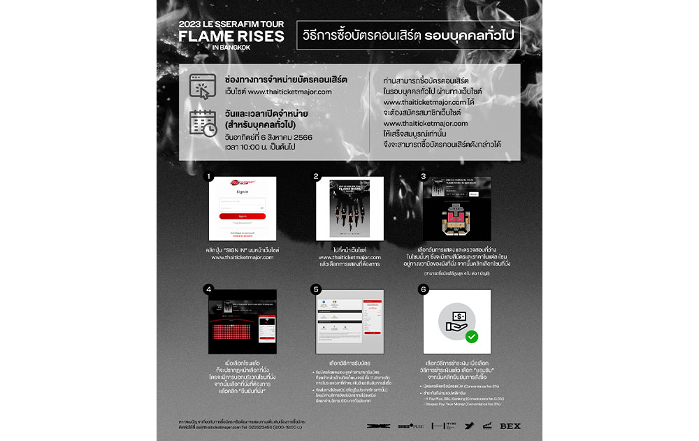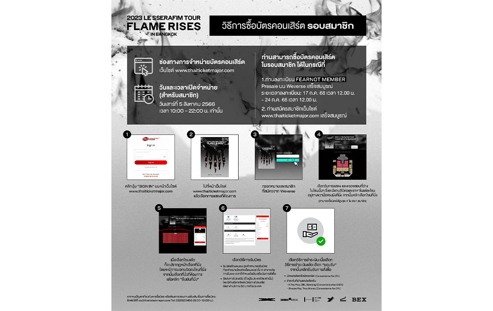 “FEARNOT” (ชื่อกลุ่มแฟนคลับ) ชาวไทยเตรียมตัวให้พร้อม แล้วมาฟินไปด้วยกันในงาน “2023 LE SSERAFIM TOUR ‘FLAME RISES’ IN BANGKOK” โดยงานนี้ได้ “BEX” ในเครือเวิร์คพอยท์กรุ๊ปเป็นผู้จัดงาน ร่วมกับ “SOURCE MUSIC”, “HYBE”, “YJ PARTNERS” และ “PROUD2” ที่เคยสร้างความประทับใจให้กับแฟน ๆ มาแล้วในหลายคอนเสิร์ต