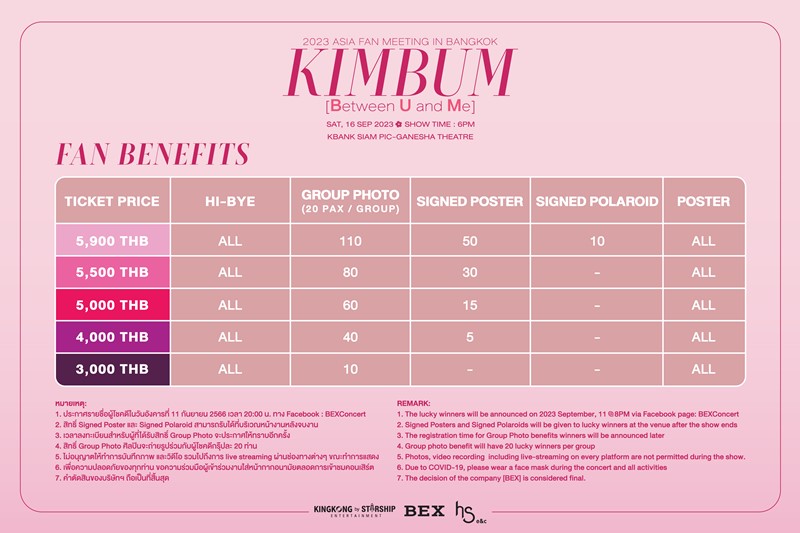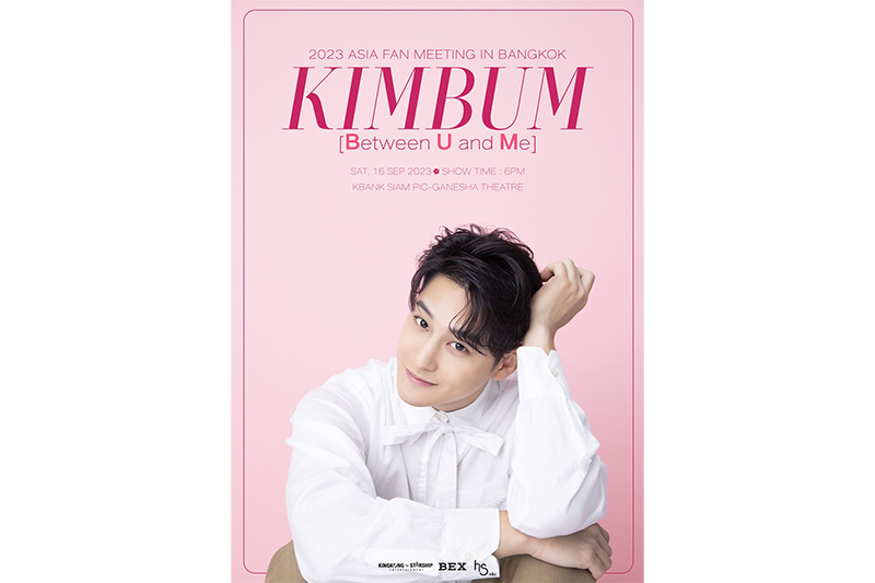 งาน “2023 KIM BUM ASIA FAN MEETING IN BANGKOK [Between U and ME]” สุดพิเศษนี้ สร้างสรรค์โดย BEX (เบ็ก) ร่วมกับ KINGKONG by STARSHIP (คิงคอง บาย สตาร์ชิป) และ HS E&C (เฮชเอส อี แอนด์ ซี) และงานจะจัดขึ้นในวันเสาร์ที่ 16 กันยายน 2566 เวลา 18:00 น. ณ โรงละครเคแบงก์สยามพิฆเนศ บัตรราคา 5,900 / 5,500 / 5,000 / 4,000 และ 3,000 บาท เปิดจำหน่ายบัตรทาง www.thaiticketmajor.com และ ไทยทิคเก็ตเมเจอร์ เคาน์เตอร์ ในวันที่ 12 สิงหาคม 2566 ตั้งแต่เวลา 10:00 น. เป็นต้นไป