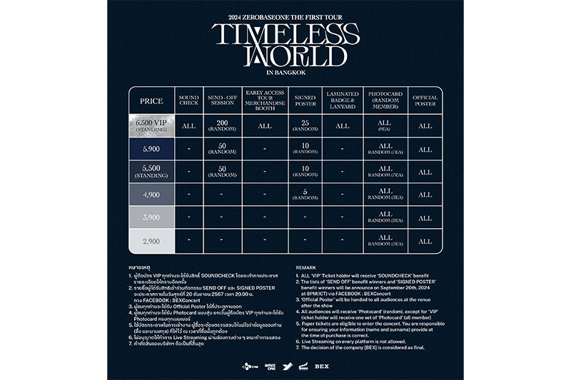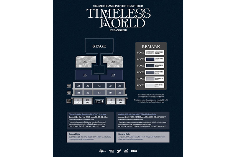 Ticket sales will open for 2 rounds. “Global Official Fanclub (ZEROSE) Pre-sale” round will be available on Saturday, August 24th 2024, from 10:00 a.m. to 22:00 p.m. on www.thaiticketmajor.com and Global Official Fanclub (ZEROSE) membership registration must be completed by PLUS CHAT from July 29th 2024 12:00 a.m. to August 2nd 2024, 23:59 p.m. . For "General Sale” round will be available on Sunday, August 25th 2024 10:00 a.m. onwards on www.thaiticketmajor.com