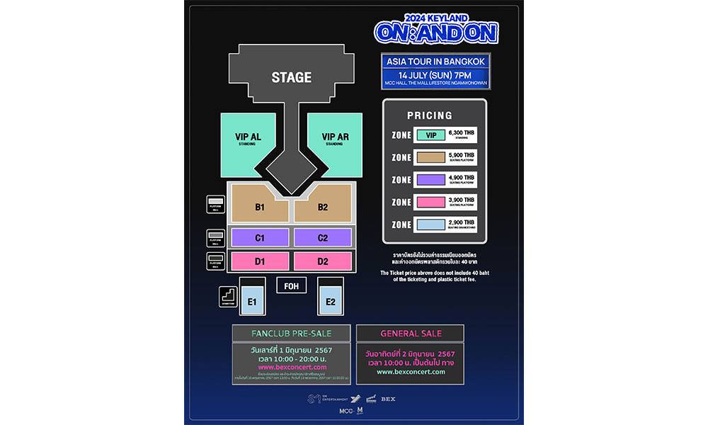 โดยงาน “2024 KEYLAND ON : AND ON ASIA TOUR in BANGKOK” จะถูกจัดขึ้นในวันอาทิตย์ที่ 14 กรกฎาคม 2567 เวลา 19:00 น. ณ MCC HALL, เดอะมอลล์ไลฟ์สโตร์ งามวงศ์วาน บัตร VIP ราคา 6,300 / 5,900 / 4,900 / 3,900 และ 2,900 บาท โดยเปิดจำหน่าย 2 รอบ รอบ MEMBERSHIP PRESALE ในวันเสาร์ที่ 1 มิถุนายน 2567 เวลา 10:00 – 20:00 น. ทาง www.bexconcert.com และรอบ GENERAL SALE (บุคคลทั่วไป) ในวันอาทิตย์ที่ 2 มิถุนายน 2567 เวลา 10:00 น. ทาง www.bexconcert.com โดยสามารถสมัครสมาชิกได้ตั้งแต่วันที่ 16 พฤษภาคม 2567 เวลา 12:00 น. ถึง วันที่ 18 พฤษภาคม เวลา 11:59:59 น. (เวลาประเทศไทย) ทาง https://fanevent.weverse.io/links?e=304 สามารถติดตามข่าวสารกิจกรรมและข้อมูลต่าง ๆ เพิ่มเติมได้ที่ Facebook และ X: @BEX_Concert